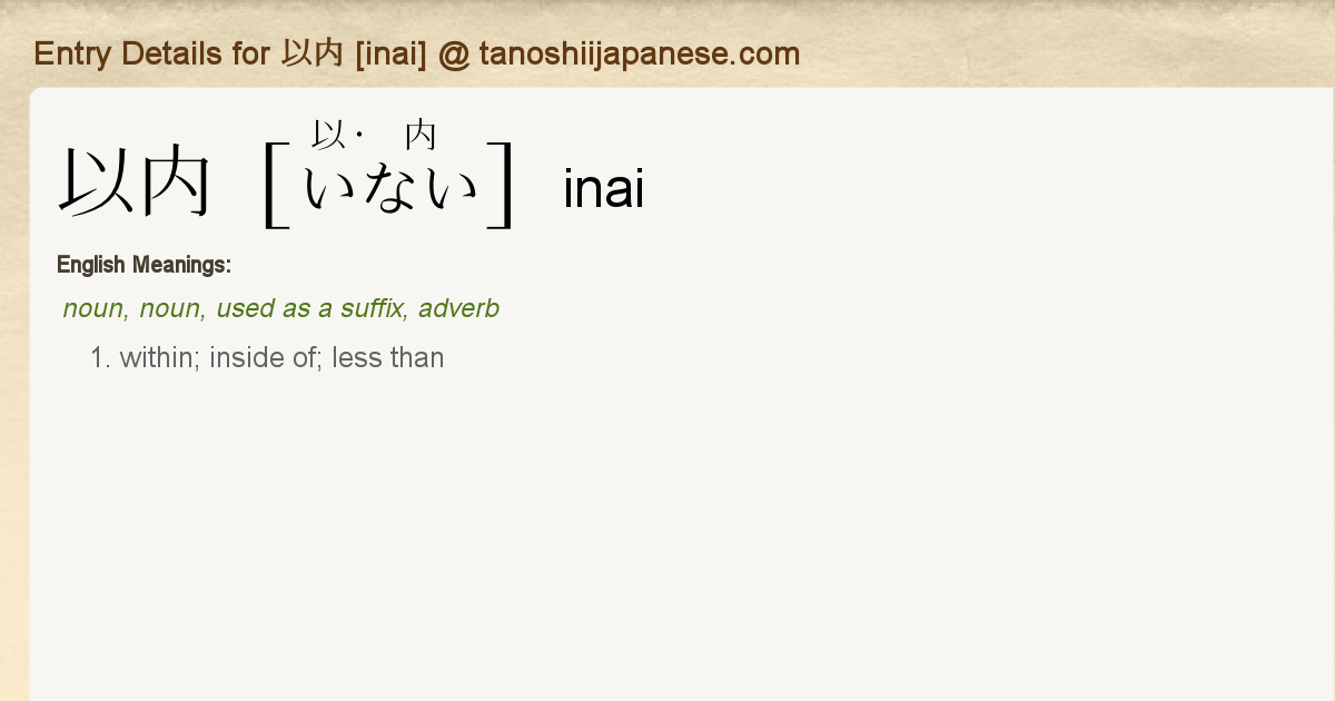 However most people agree that homemade sushi is the best. It is also available in various supermarket delis. More meanings for 以内 Inai less than adverb.